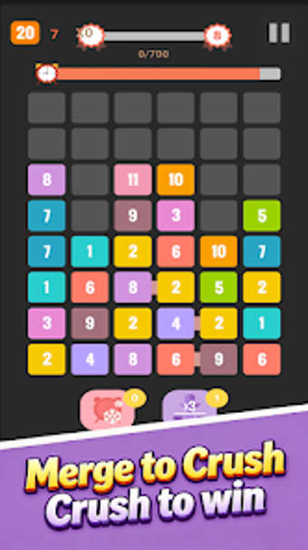 Merge n Crush es un juego de rompecabezas adictivo diseñado para jugadores de todas las edades. La mecánica es sencilla: arrastra un bloque de número aleatorio sobre otro bloque con el mismo número para fusionarlos y crear un número mayor. Aunque al principio es fácil, alcanzar puntuaciones más altas requiere habilidad y rapidez. Solo los jugadores más dedicados lograrán fusionar números hasta 20, lo que añade un reto interesante al juego.